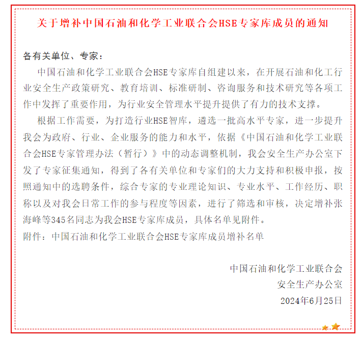 近日,“中國石化聯合會安全生產辦公室”正式發布《關于增補中國石油和化學工業聯合會HSE專家庫成員的通知》,我公司黨支部委員、總法律顧問、工會主席張明同志憑借其深厚的專業知識和豐富的實踐經驗成功入選“中國石油和化學工業聯合會”HSE專家庫。