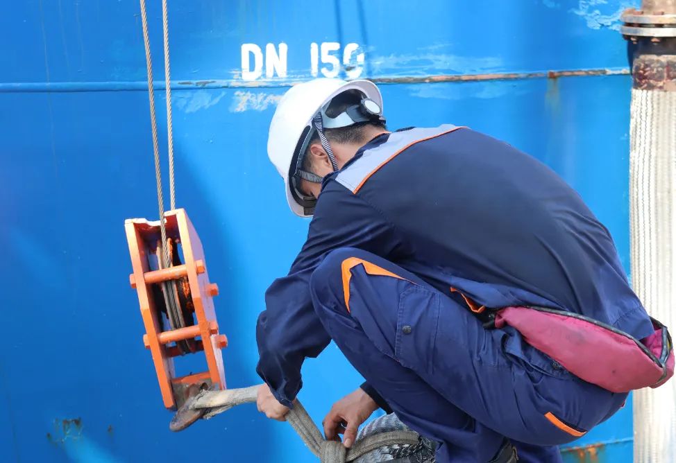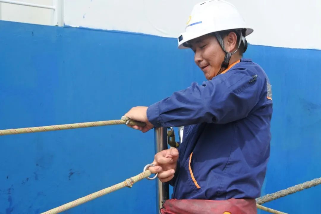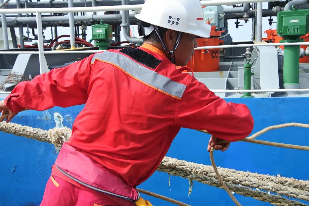 高溫天氣“超長待機”中,碼頭班成員們身著工作服、頭戴安全帽緊張而有序地穿梭于各項關鍵任務之間—從精細的管線清洗到嚴謹的洗艙作業,再到繁忙的裝卸船流程,每一個動作都顯得那么迅速而精準。他們那被歲月與辛勤汗水共同塑造的黝黑健康膚色,成為了無聲的榮譽標志,默默講述著每一次面對挑戰時的堅韌不拔,記錄著每一次對對職責的堅守。