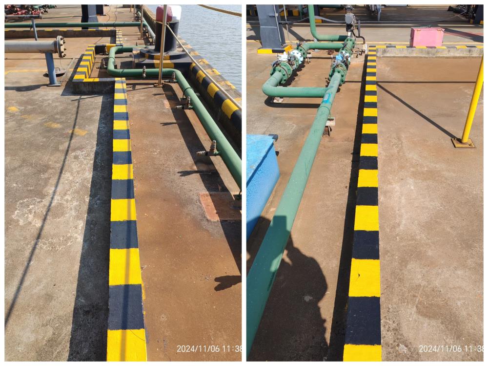 為了解決碼頭安全警示標識線因長期受自然侵蝕而造成的褪色問題。本月,公司組織相關人員利用工作間隙,全面開展了標識線的重新涂漆作業。此舉不僅顯著提升了碼頭的整體美觀性,同時也為安全的作業環境提供了更加堅實的保障。