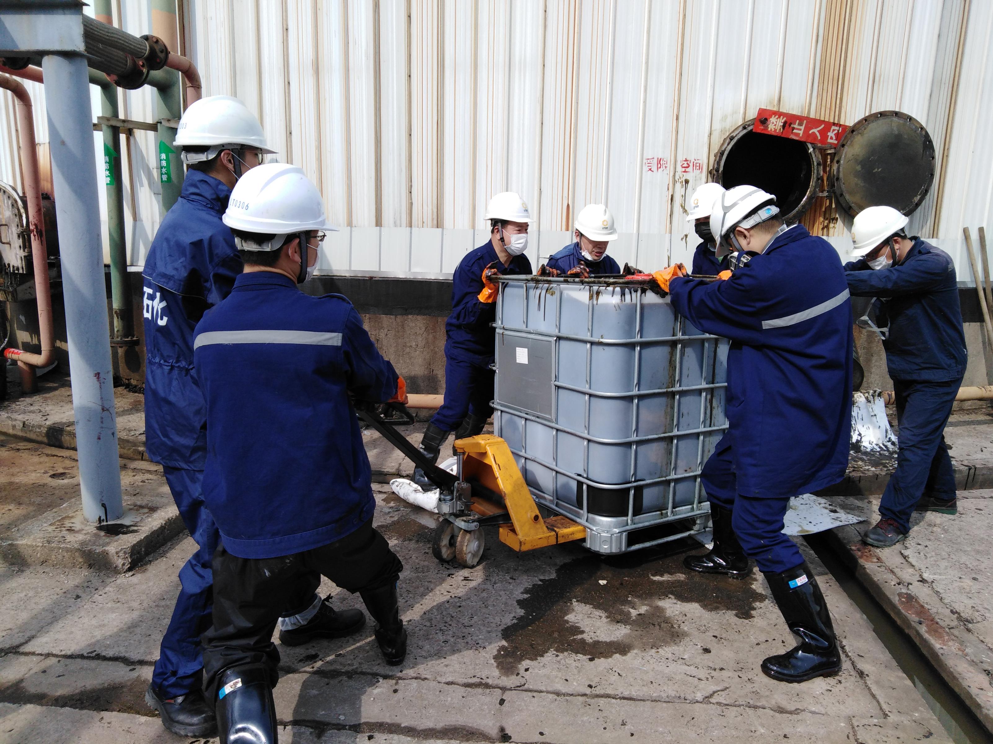 為適應后期業務更換品種,需要對3209罐進行徹底清洗,罐內原存儲品種黏稠度很大,給清洗儲罐帶來了巨大的挑戰,必須使用大量的人工清理。勞動過程中,大家不怕臟不怕累,齊心協力將物料殘渣一桶一桶地運送出來,別看一個立方桶不大,要把它裝滿卻要經過無數次的重復倒灌。雖然天氣寒冷,但是大家干得滿身是汗,雖已經精疲力盡,但稍作休息后又全身心投入到勞動中。